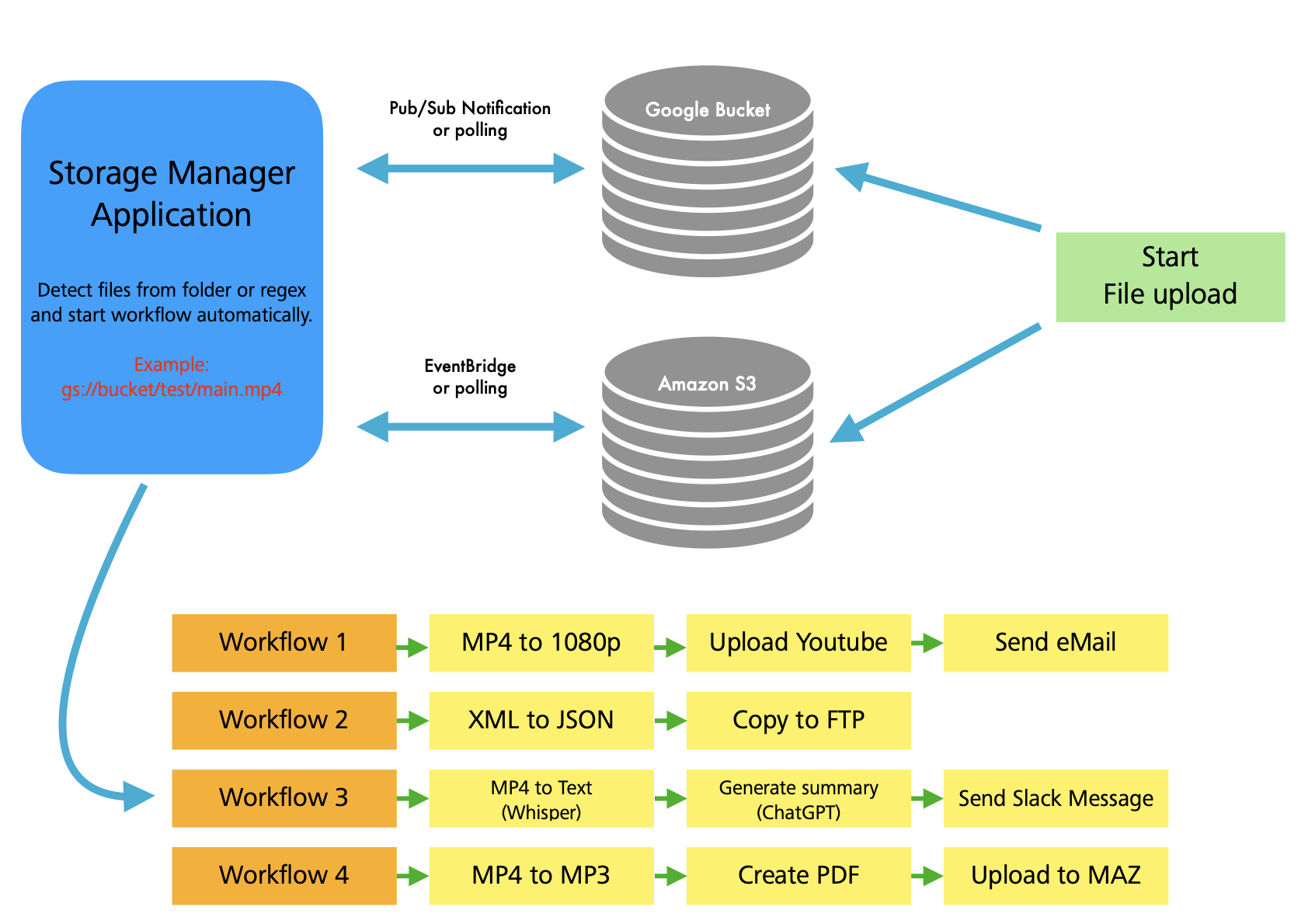 Der Storage Manager verbindet sich direkt mit Ihrem Google Cloud Storage, Amazon S3 oder WebDAV-Storage und führt gezielt automatische Workflows auf neue Inhalte aus. Neue Dateien werden erkannt und anhand von Metadaten, Dateinamen oder Ordnerstrukturen ausgewertet.